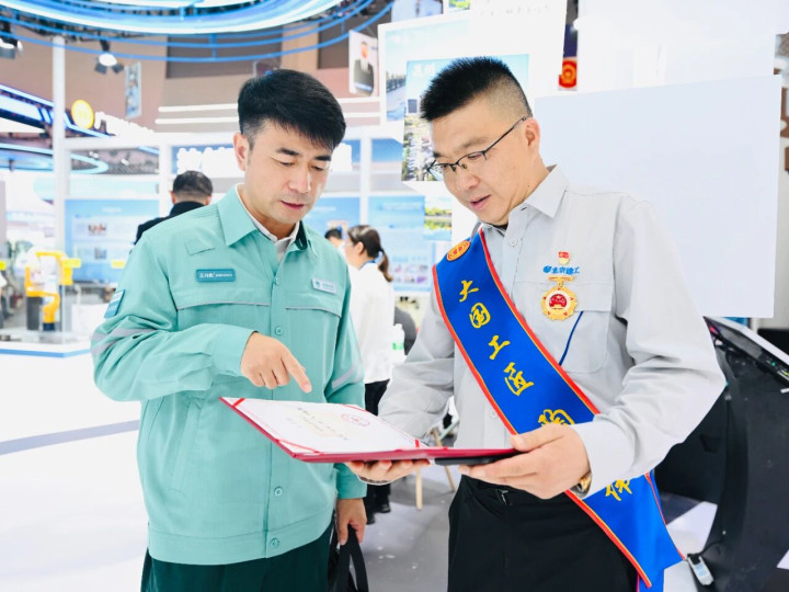 展会现场,大国工匠王月鹏、陶建伟围绕技能成才、技能报国之路深入交流。
