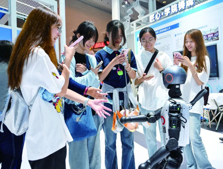 来自北京科技职业大学的“0306小巨人”与观众握手互动。